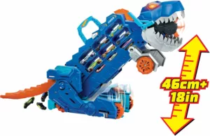 Le Transporteur T-Rex Hot Wheels est un excellent choix : il combine transformation, sons et rangement pour des heures d’aventures.