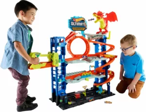 Le Garage Ultimate HKX48 est une véritable tour de jeu Hot Wheels ! Quatre niveaux de courses, un ascenseur motorisé, des loopings et un dragon géant à affronter : de quoi créer des histoires spectaculaires pendant des heures. Parfait pour les enfants de 5 à 10 ans, il offre aussi un rangement pratique pour plus de 50 voitures 1/64.